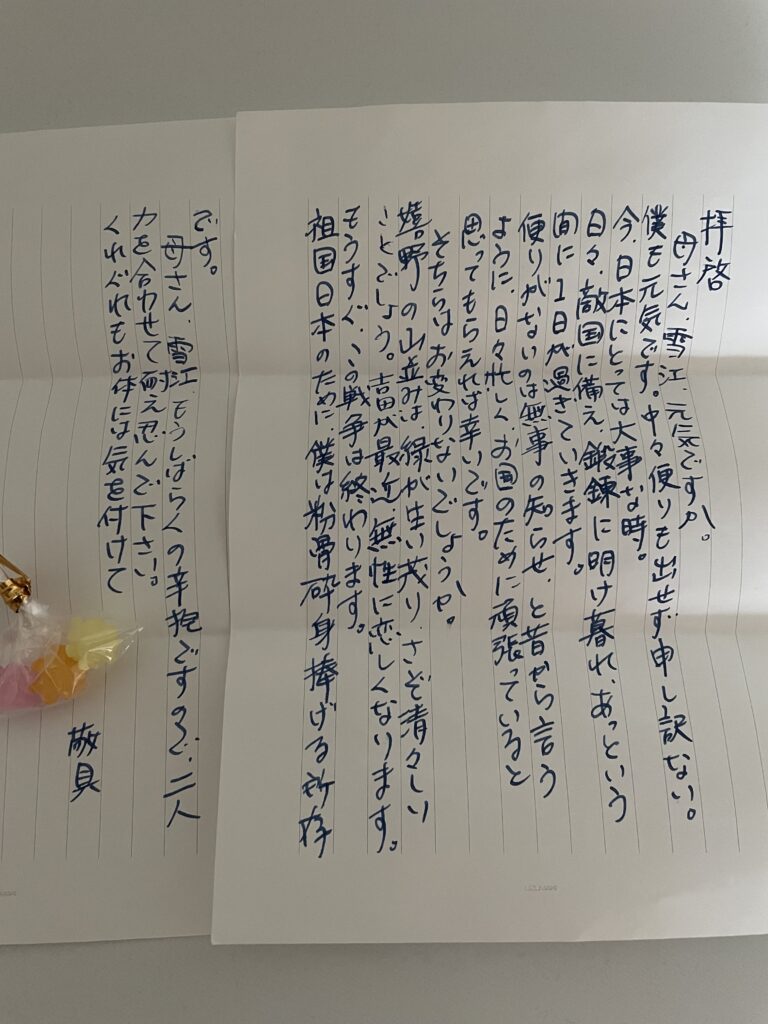 写真は助けてもらった小道具のひとつ、旦那様からの手紙です。月組の秋山稔役の船戸さんが書いてくれました。封筒は秋葉さんの手作り!(写真撮り忘れました。。)
