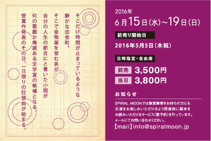| お知らせ | SPIRAL MOONでは聴覚障害をお持ちの方にも公演をお楽しみ頂けるよう開演前に脚本をお読みいただけるサービス(要予約)を行っています。詳細はinfo@spiralmoon.jpまでお問合せ下さい |